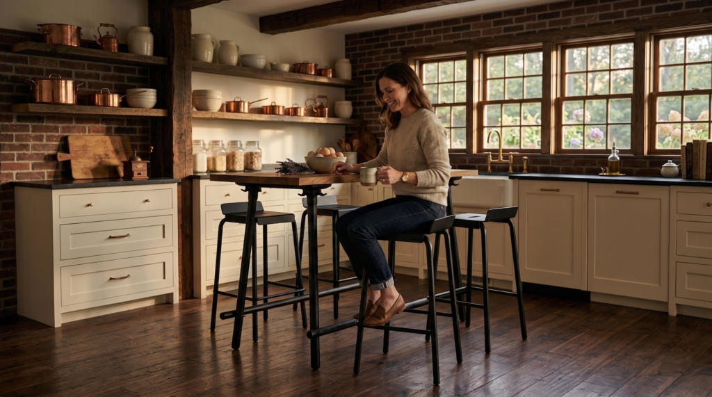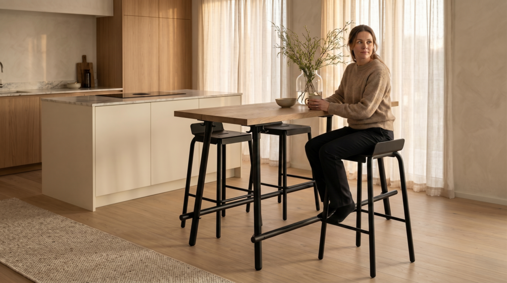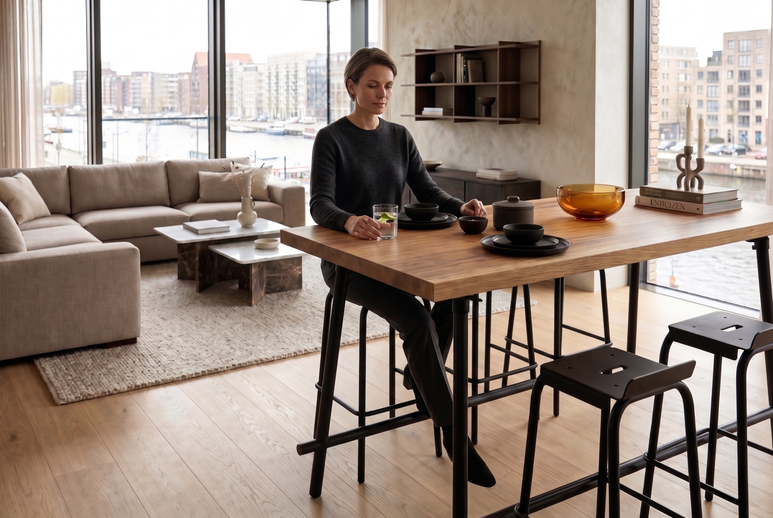 Het is geen tafel voor een formeel diner, maar een hoge plek waar je aan hangt. Een tafel die staat als een huis en de uitstraling heeft die bij je eigen plek hoort.